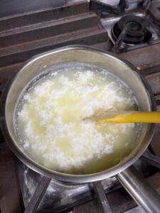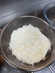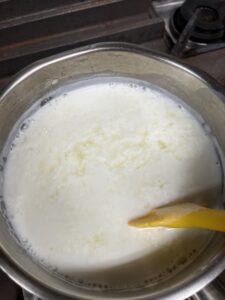 これをざるで固まった乳脂肪分と水分(ホエー)にわけます