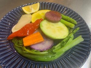 旬の野菜を短時間蒸した料理です。