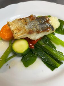 シンプルにグリルした魚に、旬の野菜を蒸して添えました。