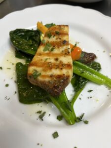 定番の魚のグリルにレモンオイル、オレガノ、蒸し野菜を添えた一品。