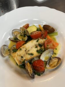 アサリのダシがたっぷりの白ワインによく合う魚料理です。