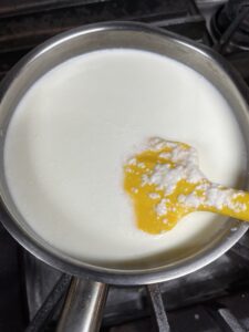 2・火を止めレモン汁を加え分離するまでゆっくり混ぜる