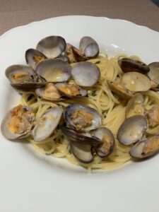 今が旬のアサリのスパゲッティにイタリア産カラスミたっぷりかけた定番料理です。
