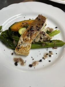 グリルしたお魚に蒸し野菜とアンチョビを添えました。